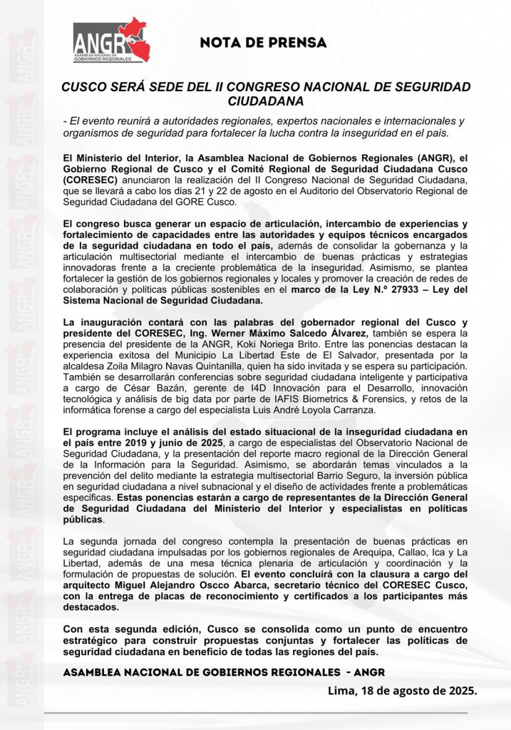 CUSCO SERÁ SEDE DEL II CONGRESO NACIONAL DE SEGURIDAD CIUDADANA